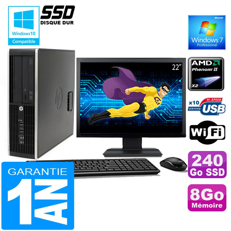 PC HP Compaq 6005 Pro SFF AMD Phenom II Ram 8Go Disque 240 Go SSD Wifi Ecran 22"