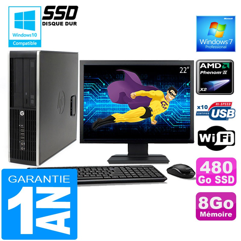PC HP Compaq 6005 Pro SFF -AMD Phenom II X2 B57 3.2Ghz (6 Mo de cache) - 8 Go DDR3 - Disque Dur 480 Go SSD - Graveur DVD - Clé WIFI USB - Windows 7 Pro - Pack Clavier + Souris + Ecran 22" ( Marque et modèle selon arrivages) - Garantie = 1 an.