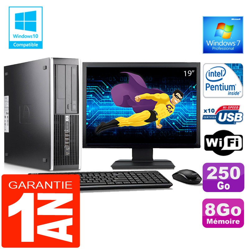 PC HP Compaq 6000 Pro SFF - Intel® Pentium® E6300 2,80Ghz (2 Mo de cache) - 8 Go DDR3 - Disque Dur 250 Go - Graveur DVD - Clé WIFI USB - Windows 7 Pro - Pack Clavier + Souris + Ecran 19" ( Marque et modèle selon arrivages) - Garantie = 1 an.