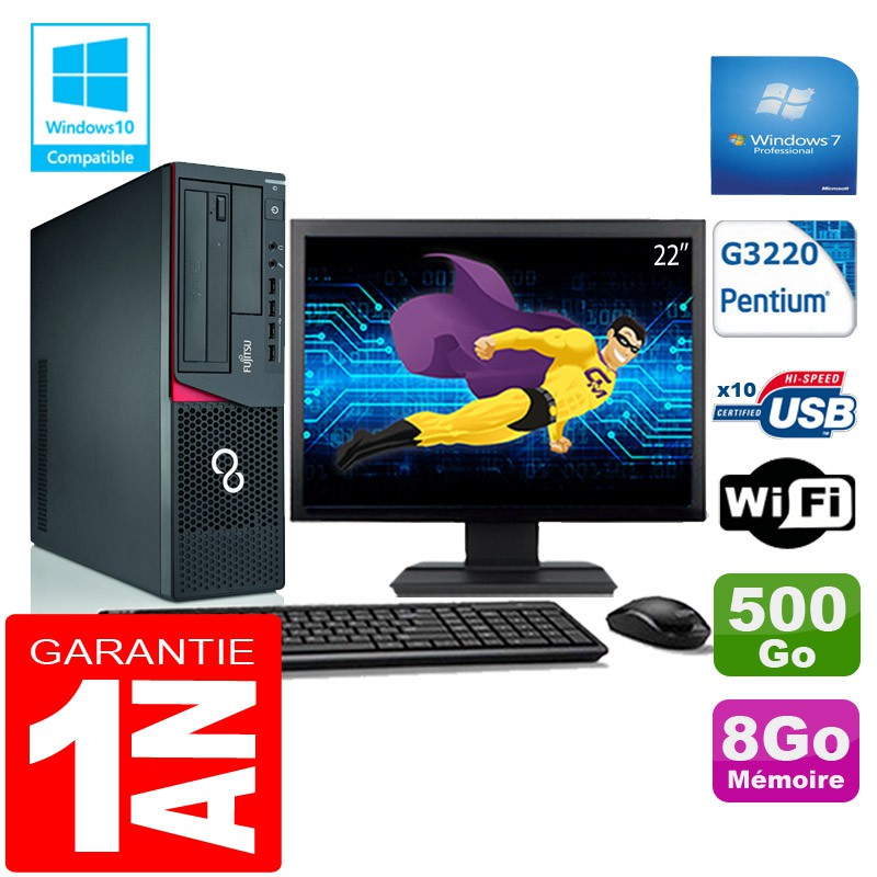 PC Fujitsu Esprimo E720 E85+ SFF G3220 RAM 8Go Disque 500 Go Wifi W7 Ecran 22"