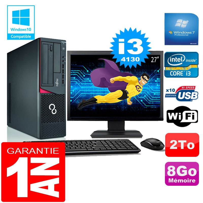 PC Fujitsu Esprimo E720 E85+ SFF Core I3-4130 8Go Disque 2 To Wifi W7 Ecran 27"