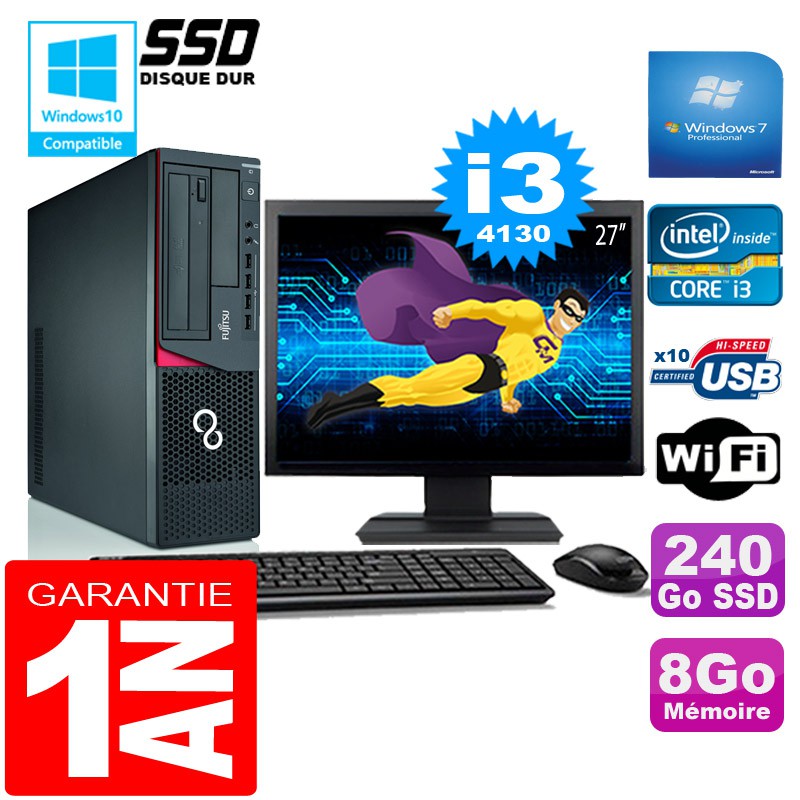 PC Fujitsu Esprimo P400 - Intel Core I3-4130 3,4Ghz (3 Mo de cache) - 8Go DDR3 - Disque Dur 240 Go SSD - Graveur DVD - Clé WIFI USB - Windows 7 Pro - Pack Clavier + Souris + Ecran 27" ( Marque et modéles selon arrivages) - Garantie = 1 an.