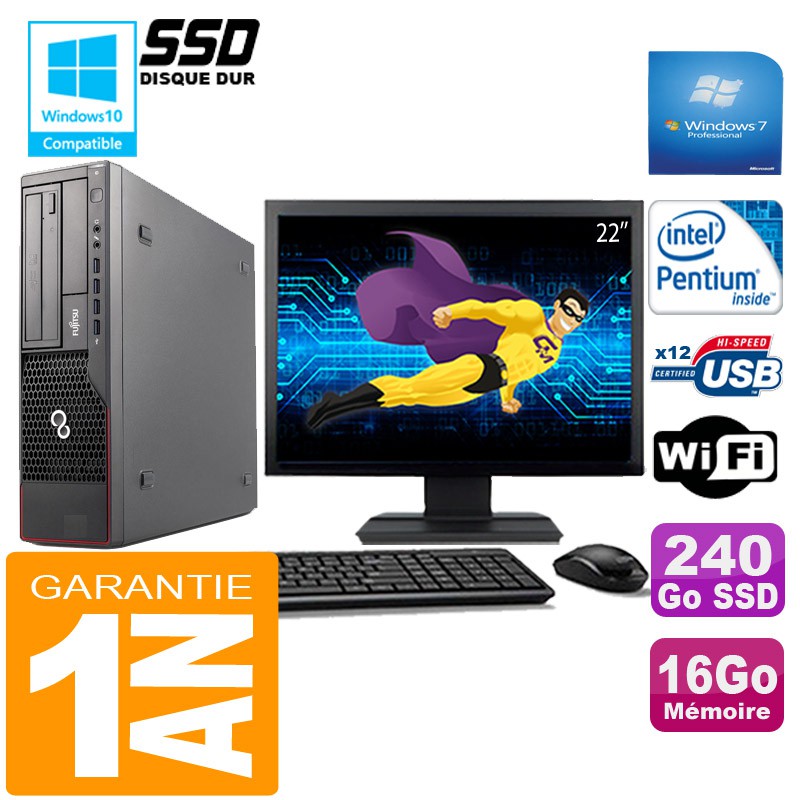 PC Fujitsu Esprimo E700 E90+ SFF G840 16Go Disque 240 Go SSD Wifi W7 Ecran 22"