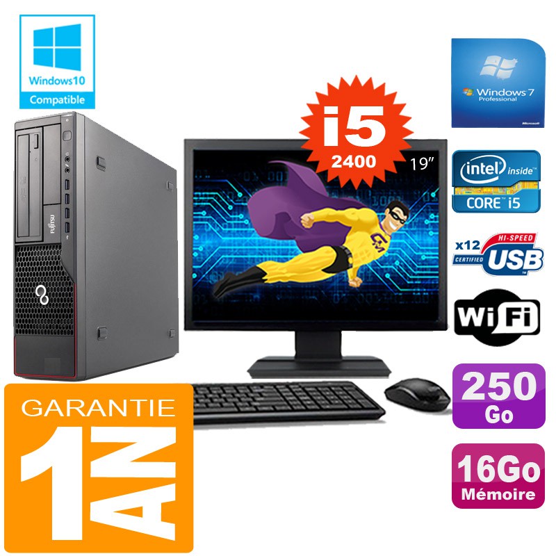 PC Fujitsu Esprimo E700 E90+ SFF - Intel Core I5-2400 3,1Ghz - 16Go DDR3 - Disque Dur 250Go - Graveur DVD - Clé WIFI USB - Windows 7 Pro - Pack Clavier + Souris + Ecran 19" ( Marque et modéles selon arrivages) - Garantie = 1 an.