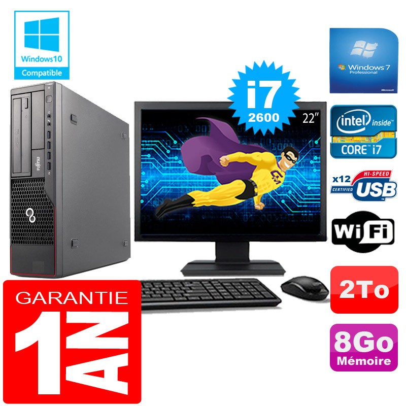 PC Fujitsu Esprimo E700 E90+ SFF Core I7-2600 8Go Disque 2 To Wifi W7 Ecran 22"