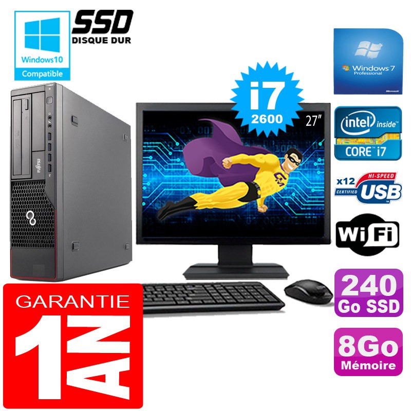 PC Fujitsu Esprimo E700 E90+ SFF - Intel Core I7-2600 3,4Ghz - 8Go DDR3 - Disque Dur 240 Go SSD - Graveur DVD - Clé WIFI USB - Windows 7 Pro - Pack Clavier + Souris + Ecran 27" ( Marque et modéles selon arrivages) - Garantie = 1 an.