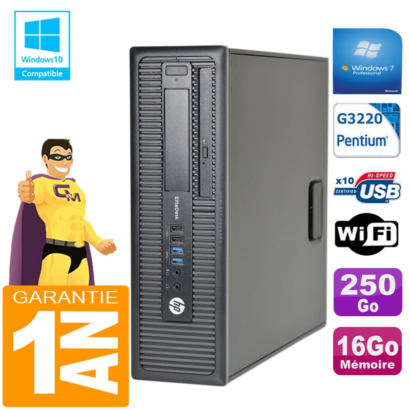 PC HP EliteDesk 800 G1 SFF - Intel Pentium G3220 3.0GHz (3 Mo de cache) - 16Go DDR3 - Disque Dur 250Go - Graveur DVD - Clé WIFI USB - Windows 7 Pro - Garantie = 1 an.
