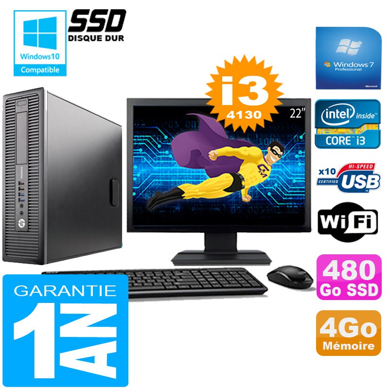 PC HP EliteDesk 800 G1 SFF Core I3-4130 4Go Disque 480 Go SSD Wifi W7 Ecran 22"