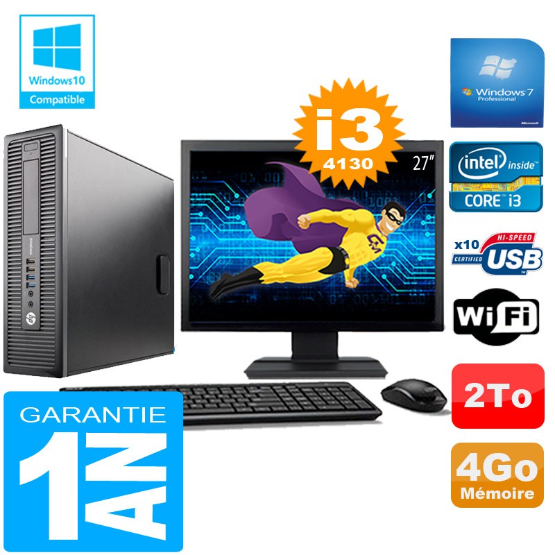 PC HP EliteDesk 800 G1 SFF Core I3-4130 4Go Disque 2 To Wifi W7 Ecran 27"