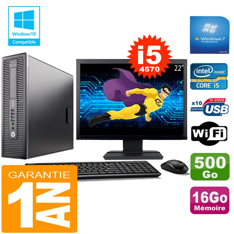 PC HP EliteDesk 800 G1 SFF Core I5-4570 16Go Disque 500 Go Wifi W7 Ecran 22"