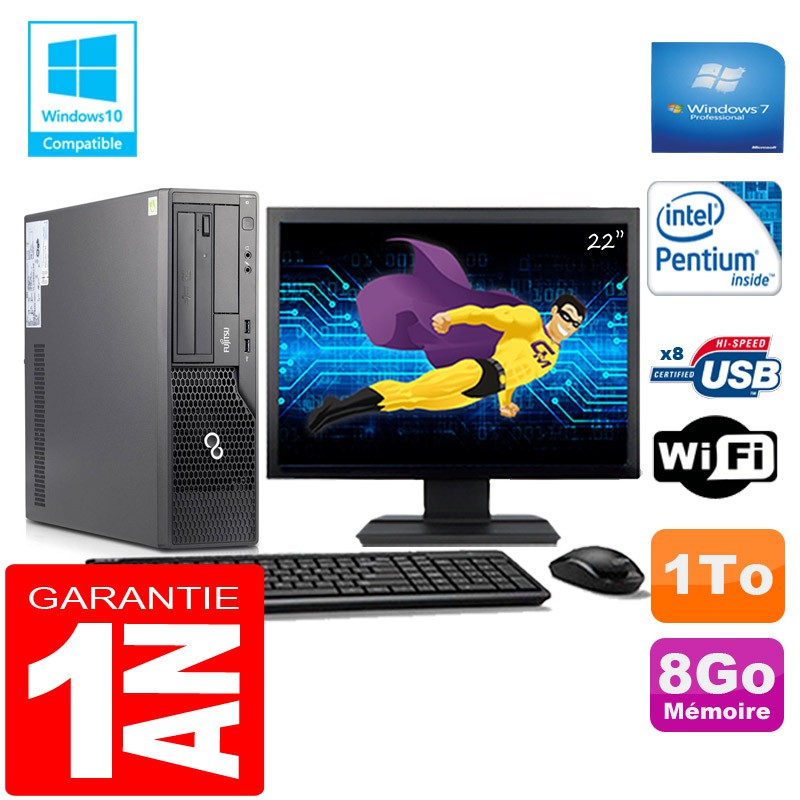 PC Fujitsu Esprimo E500 E85+ SFF Intel G640 8Go Disque 1 To Wifi W7 Ecran 22"
