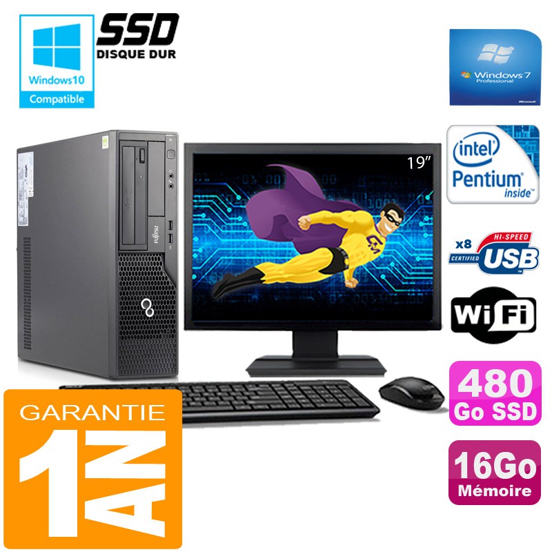 PC Fujitsu Esprimo E500 E85+ SFF G640 16Go Disque 480Go SSD Wifi W7 Ecran 19"