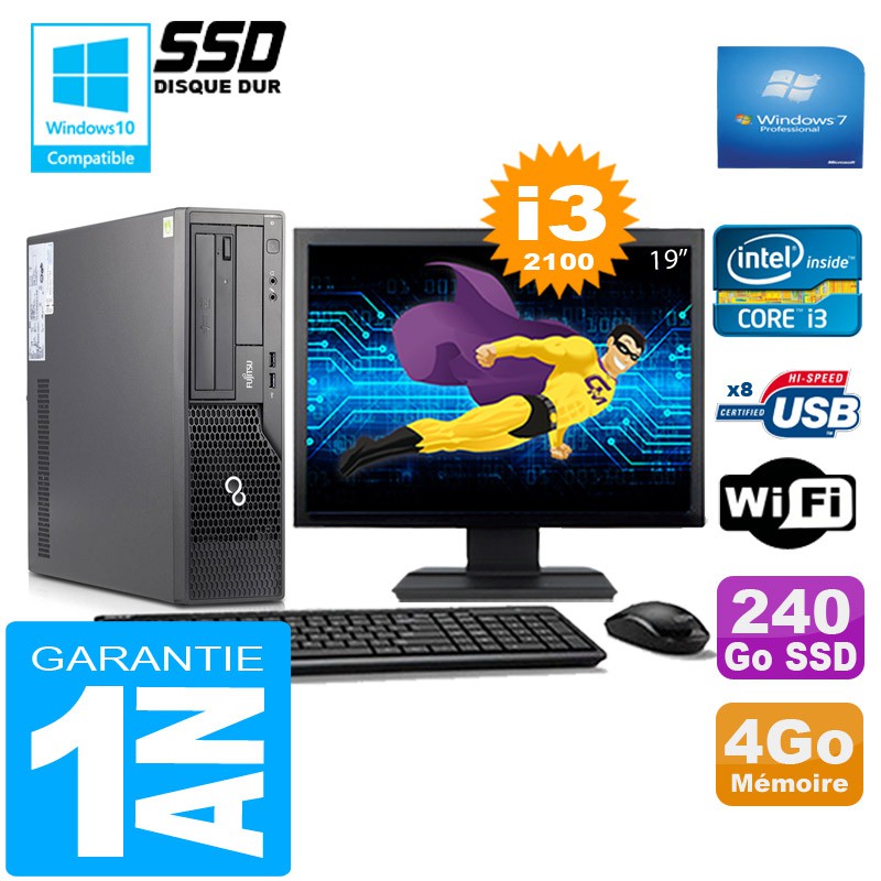 PC Fujitsu Esprimo E500 E85+ SFF I3-2100 4Go Disque 240Go SSD Wifi W7 Ecran 19"