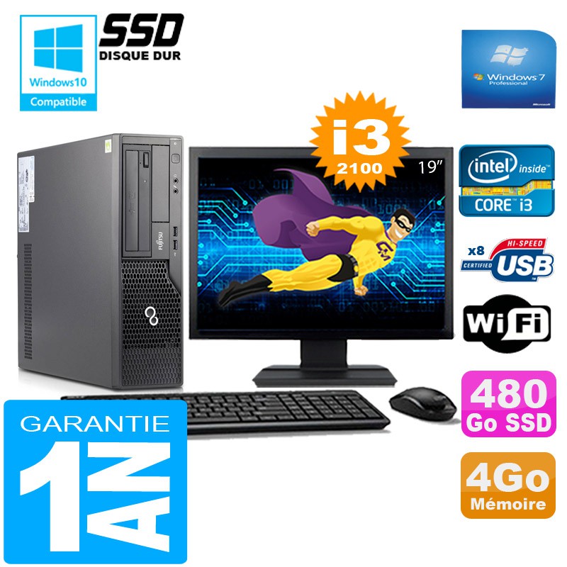 PC Fujitsu Esprimo E500 E85+ SFF -Core I3-2100 3,10Ghz - 4Go DDR3 - Disque Dur 480 Go SSD - Graveur DVD - Clé WIFI USB - Windows 7 Pro - Pack Clavier + Souris + Ecran 19" ( Marque et modéles selon arrivages) - Garantie = 1 an.