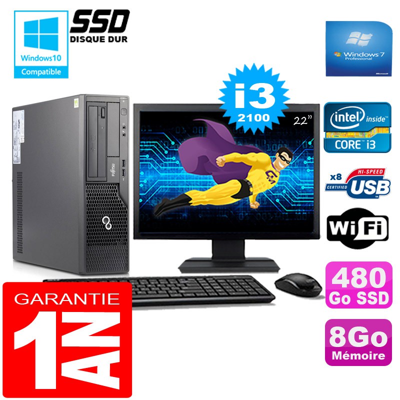 PC Fujitsu Esprimo E500 E85+ SFF -Core I3-2100 3,10Ghz - 8Go DDR3 - Disque Dur 480 Go SSD - Graveur DVD - Clé WIFI USB - Windows 7 Pro - Pack Clavier + Souris + Ecran 22" ( Marque et modéles selon arrivages) - Garantie = 1 an.