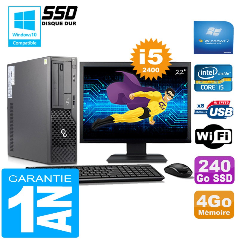 PC Fujitsu Esprimo E500 E85+ SFF I5-2400 4Go Disque 240Go SSD Wifi W7 Ecran 22"