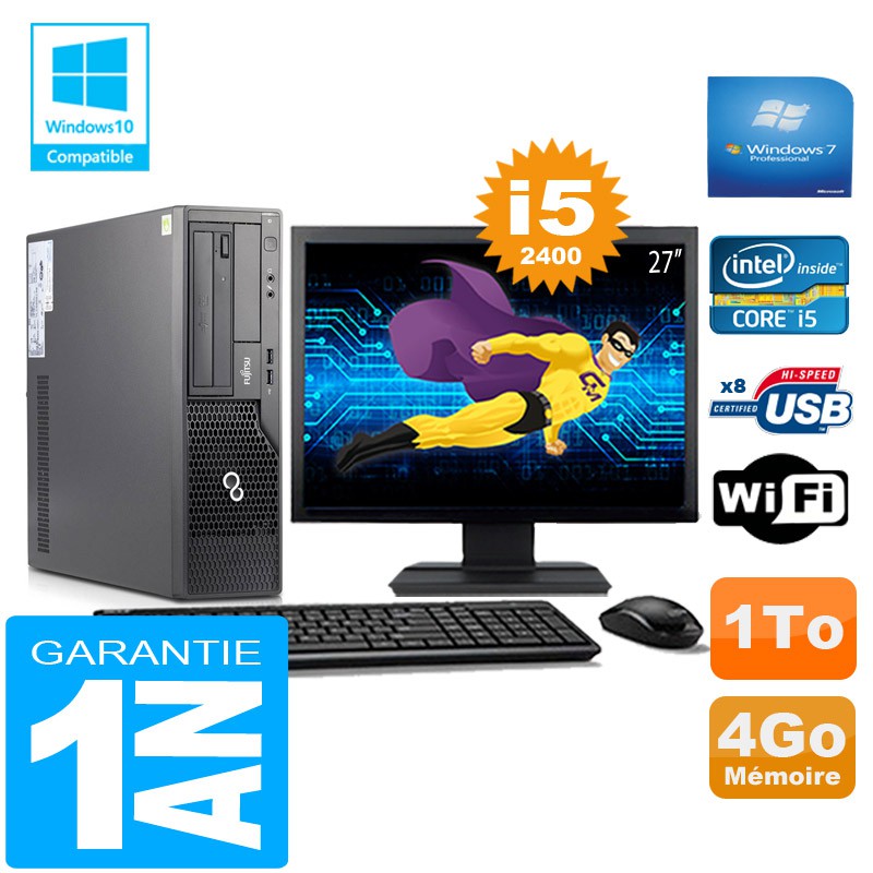 PC Fujitsu Esprimo E500 E85+ SFF - Core I5-2400 3,10Ghz - 4Go DDR3 - Disque Dur 1To - Graveur DVD - Clé WIFI USB - Windows 7 Pro - Pack Clavier + Souris + Ecran 27" ( Marque et modéles selon arrivages) - Garantie = 1 an.