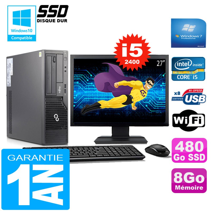 PC Fujitsu Esprimo E500 E85+ SFF - Core I5-2400 3,10Ghz - 8Go DDR3 - Disque Dur 480 Go SSD - Graveur DVD - Clé WIFI USB - Windows 7 Pro - Pack Clavier + Souris + Ecran 27" ( Marque et modéles selon arrivages) - Garantie = 1 an.