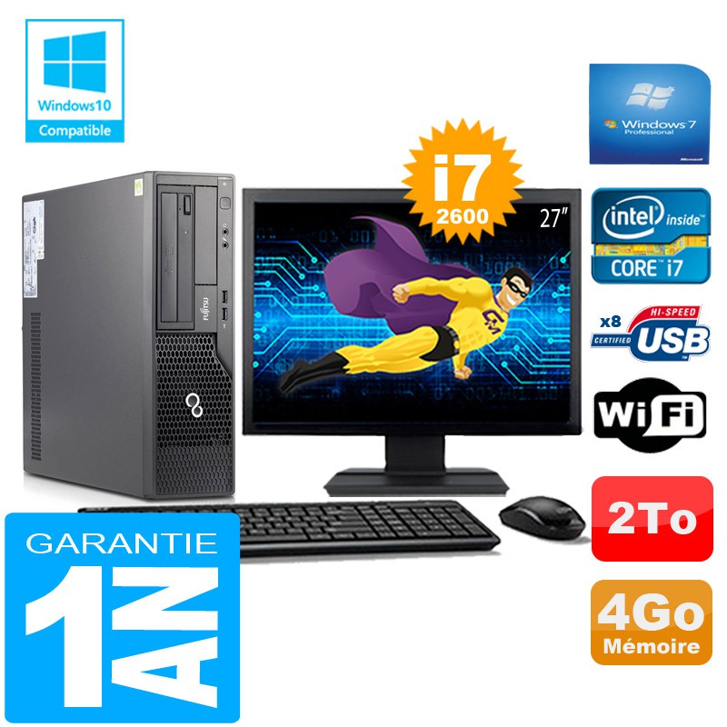 PC Fujitsu Esprimo E500 E85+ SFF - Core I7-2600 3,40Ghz - 4Go DDR3 - Disque Dur 2To - Graveur DVD - Clé WIFI USB - Windows 7 Pro - Pack Clavier + Souris + Ecran 27" ( Marque et modéles selon arrivages) - Garantie = 1 an.