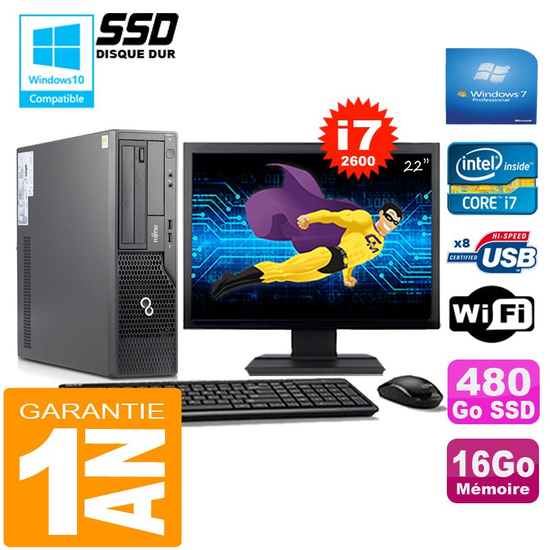 PC Fujitsu Esprimo E500 E85+ SFF - Core I7-2600 3,40Ghz - 16Go DDR3 - Disque Dur 480 Go SSD - Graveur DVD - Clé WIFI USB - Windows 7 Pro - Pack Clavier + Souris + Ecran 22" ( Marque et modéles selon arrivages) - Garantie = 1 an.
