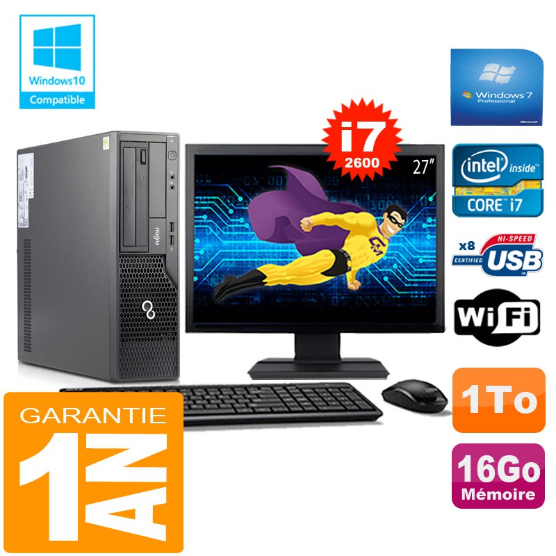 PC Fujitsu Esprimo E500 E85+ SFF - Core I7-2600 3,40Ghz - 16Go DDR3 - Disque Dur 1To - Graveur DVD - Clé WIFI USB - Windows 7 Pro - Pack Clavier + Souris + Ecran 27" ( Marque et modéles selon arrivages) - Garantie = 1 an.