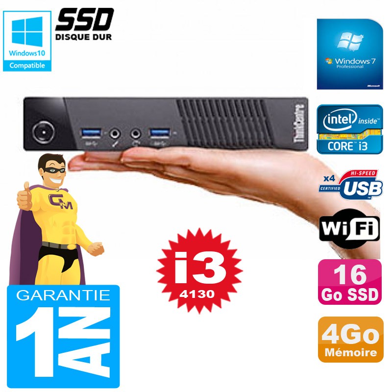 Ultra Mini PC Lenovo M73 USFF Tiny - Core I3-4130 3,4Ghz (3 Mo de cache) - 4 Go DDR3 - Disque Dur 16 Go SSD - Clé WIFI USB - Windows 7 Pro - Garantie = 1 an.
