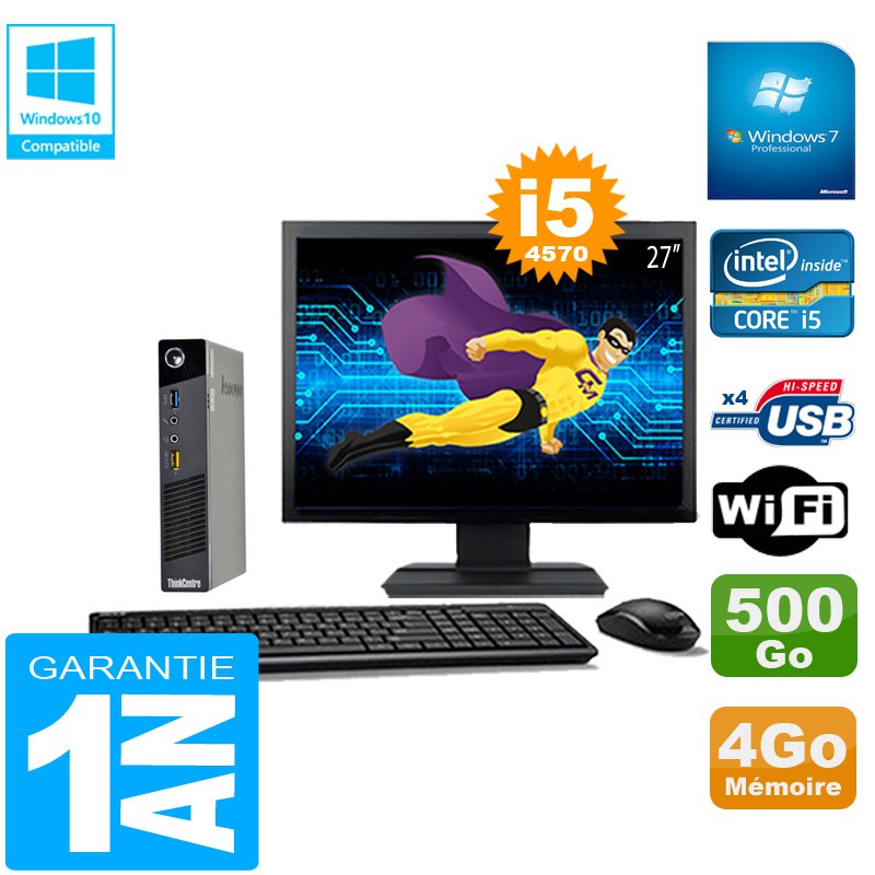 Ultra Mini PC Lenovo M73 USFF Tiny - Core I5-4570 3,2Ghz (6 Mo de cache) - 4 Go DDR3 - Disque Dur 500 Go - Clé WIFI USB - Windows 7 Pro Pack Clavier + Souris + Ecran 27" ( Marque et modèle selon arrivages) - Garantie = 1 an.