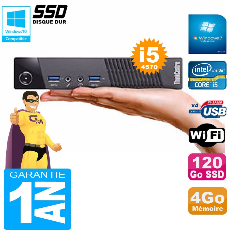 Ultra Mini PC Lenovo M73 USFF Tiny - Core I5-4570 3,2Ghz (6 Mo de cache) - 4 Go DDR3 - Disque Dur 120 Go SSD - Clé WIFI USB - Windows 7 Pro - Garantie = 1 an.