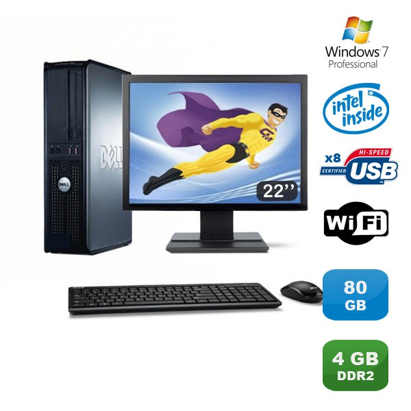 Lot PC DELL Optiplex 760 DT Dual Core E5200 2,5Ghz 4Go 80Go Wifi W7 Pro Ecran 22