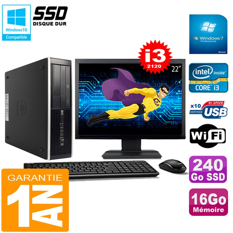 PC HP Compaq Pro 6300 SFF I3-2120 16Go 240Go SSD Graveur DVD Wifi W7 Ecran 22"