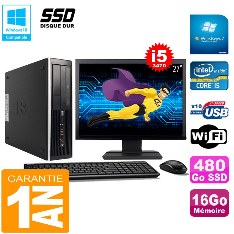 PC HP Compaq Pro 6300 SFF I5-3470 16Go 480Go SSD Graveur DVD Wifi W7 Ecran 27"