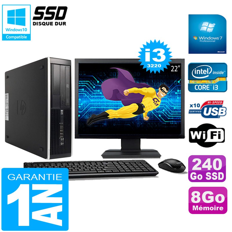 PC HP Compaq Pro 6300 SFF I3-3220 8Go 240Go SSD Graveur DVD Wifi W7 Ecran 22"