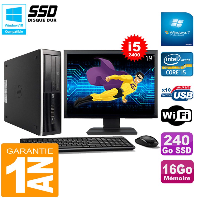 PC HP Compaq Pro 6300 SFF I5-2400 16Go 240Go SSD Graveur DVD Wifi W7 Ecran 19"