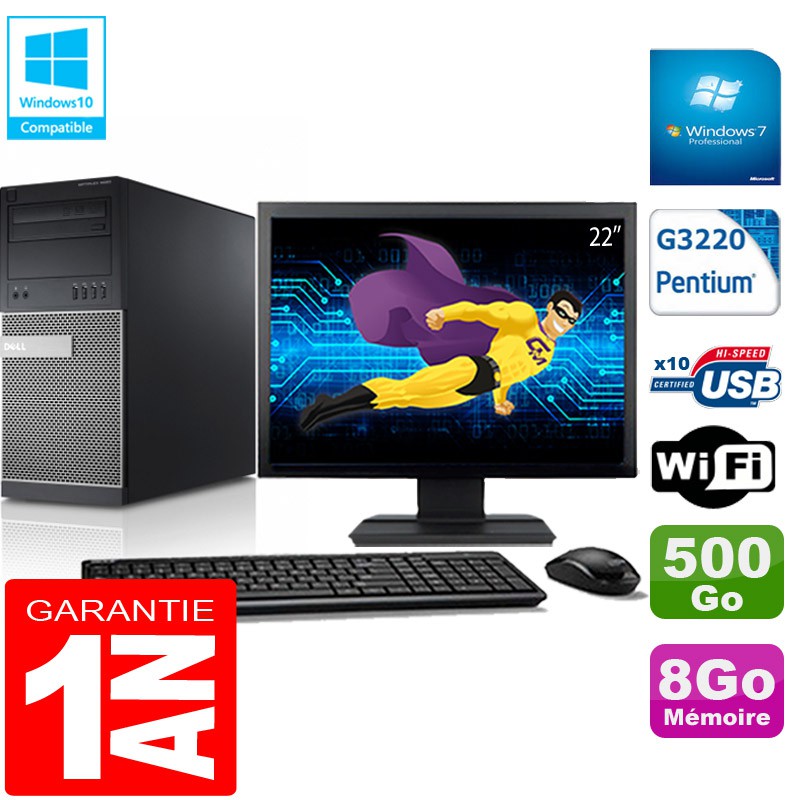 PC Tour DELL 9020 Intel G3220 Ram 8Go Disque 500 Go Wifi W7 Ecran 22"