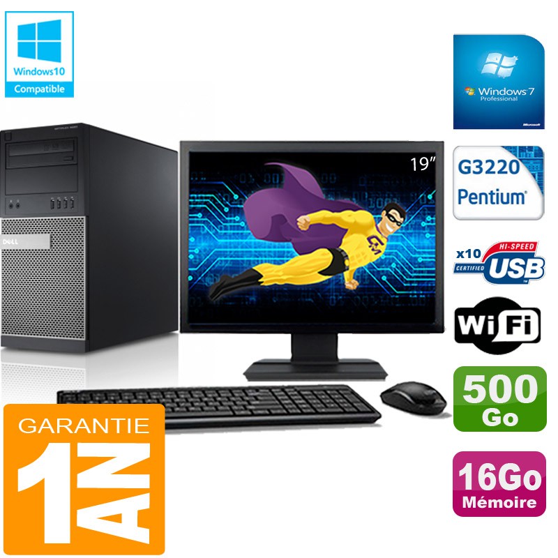 PC Tour DELL Optiplex 9020 - Intel Pentium G3220 - 16Go DDR3 - Disque Dur 500 Go - Graveur DVD - Clé WIFI USB - Windows 7 Pro - Pack Clavier + Souris + Ecran 19" ( Marque et modèle selon arrivages) - Garantie = 1 an.