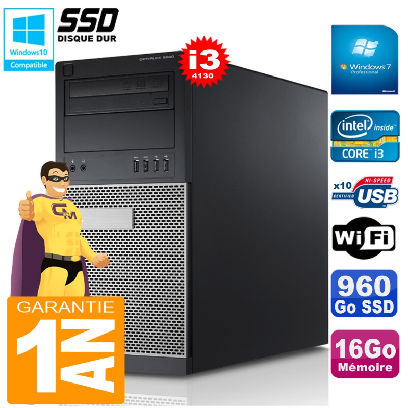 PC Tour DELL Optiplex 9020 - Intel Core I3-4130 3,4Ghz (3 Mo de cache) - 16Go DDR3 - Disque Dur 960 Go SSD - Graveur DVD - Clé WIFI USB - Windows 7 Pro - Garantie = 1 an.