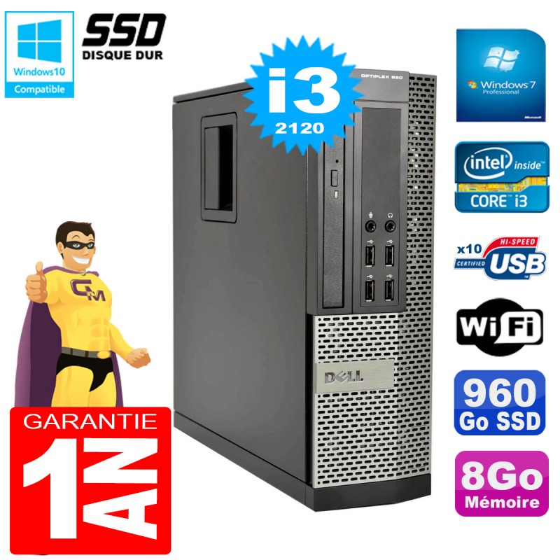 PC DELL Optiplex 990 SFF - Core I3-2120 (3 Mo de cache) - 8 Go DDR3 - Disque Dur 960 Go SSD - Graveur DVD - Clé WIFI USB - Windows 7 Pro - Garantie = 1 an.