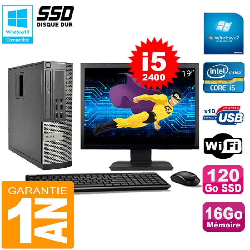 PC DELL 990 SFF Core I5-2400 Ram 16Go Disque 120Go SSD Graveur Wifi W7 Ecran 19"