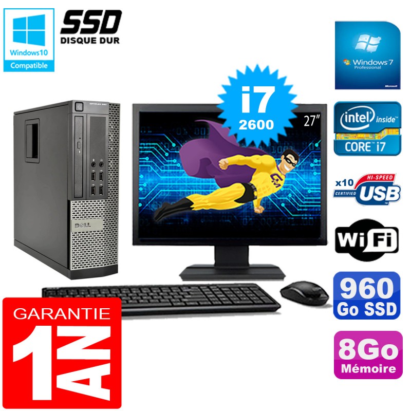 PC DELL Optiplex 990 SFF - Core I7-2600 (8 Mo de cache) - 8 Go DDR3 - Disque Dur 960 Go SSD - Graveur DVD - Clé WIFI USB - Windows 7 Pro - Pack Clavier + Souris + Ecran 27" ( Marque et modèle selon arrivages) - Garantie = 1 an.