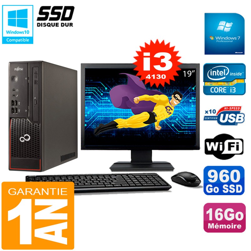 PC Fujitsu Esprimo C720 SFF - Core I3-4130 (3 Mo de cache) - 16Go DDR3 - Disque Dur 960Go SSD - Graveur DVD - Clé WIFI USB - Windows 7 Pro - Pack Clavier + Souris + Ecran 19" ( Marque et modéles selon arrivages) - Garantie = 1 an.