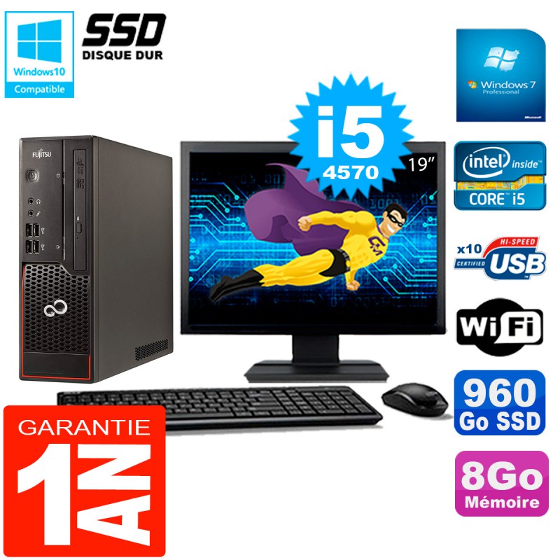 PC Fujitsu Esprimo C720 SFF - Core I5-4570 (6 Mo de cache) - 8Go DDR3 - Disque Dur 960Go SSD - Graveur DVD - Clé WIFI USB - Windows 7 Pro - Pack Clavier + Souris + Ecran 19" ( Marque et modéles selon arrivages) - Garantie = 1 an.
