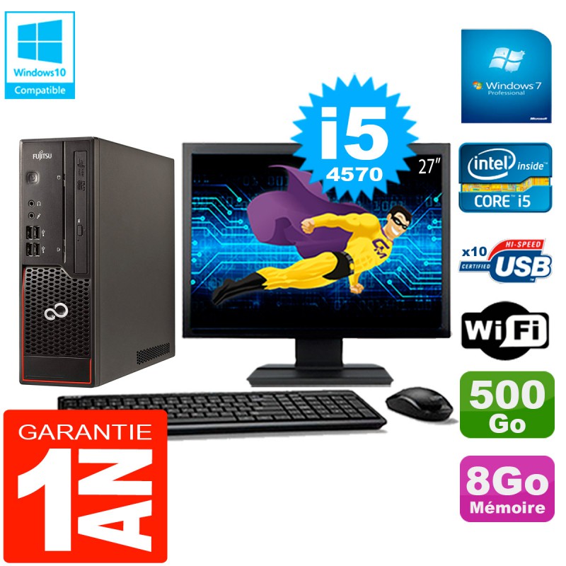 PC Fujitsu Esprimo C720 SFF - Core I5-4570 (6 Mo de cache) - 8Go DDR3 - Disque Dur 500Go - Graveur DVD - Clé WIFI USB - Windows 7 Pro - Pack Clavier + Souris + Ecran 27" ( Marque et modéles selon arrivages) - Garantie = 1 an.