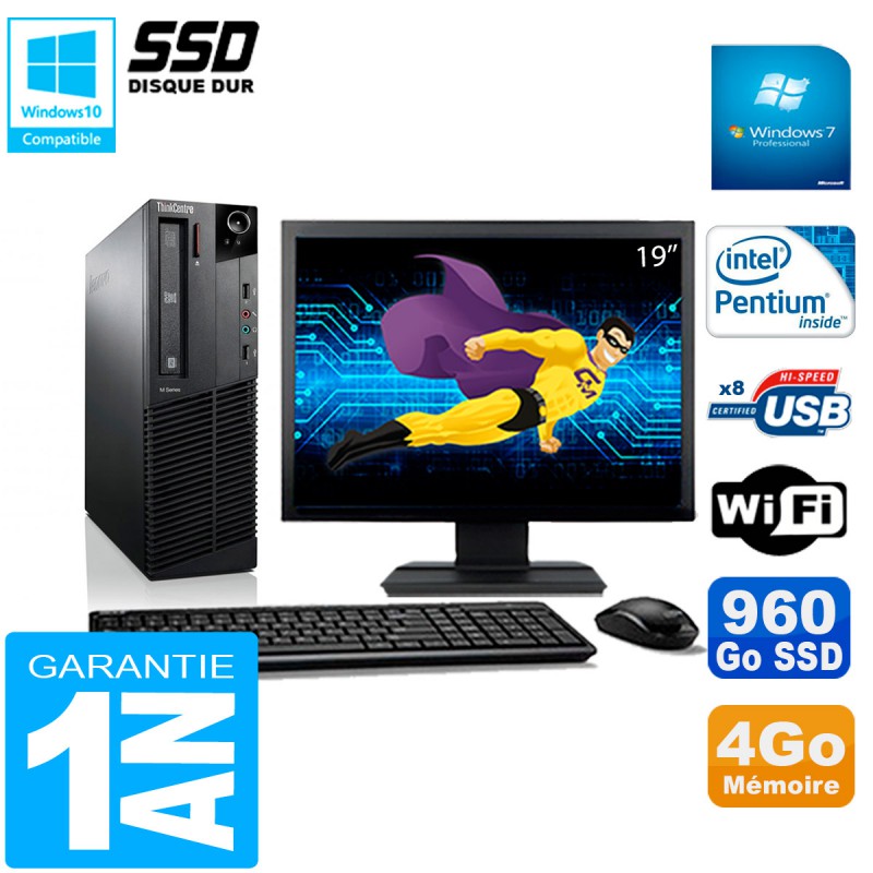 PC Lenovo M92p SFF - Intel G630 2,7Ghz (3 Mo de cache) - 4Go DDR3 - Disque Dur 960Go SSD - Graveur DVD - Clé WIFI USB - Windows 7 Pro - Pack Clavier + Souris + Ecran 19" ( Marque et modèle selon arrivages) - Garantie = 1 an.