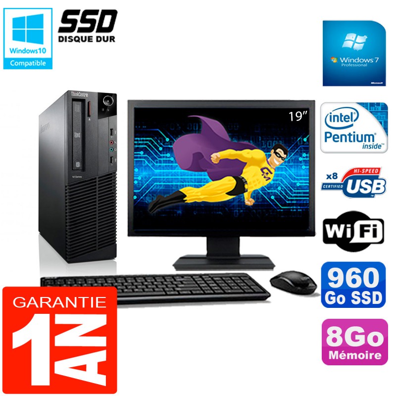 PC Lenovo M92p SFF - Intel G630 2,7Ghz (3 Mo de cache) - 8Go DDR3 - Disque Dur 960Go SSD - Graveur DVD - Clé WIFI USB - Windows 7 Pro - Pack Clavier + Souris + Ecran 19" ( Marque et modèle selon arrivages) - Garantie = 1 an.