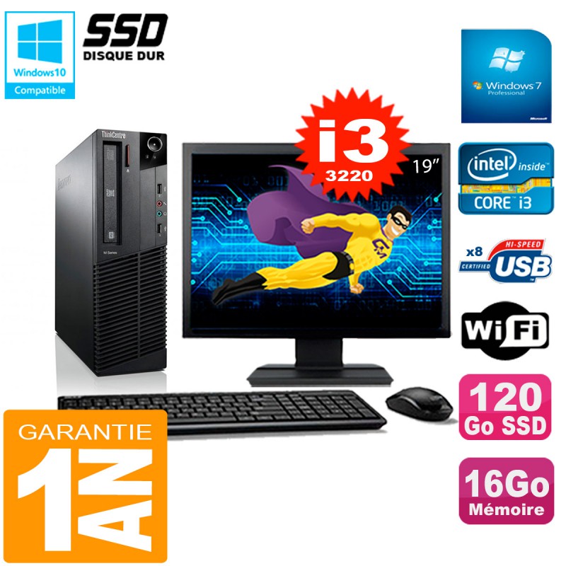 PC Lenovo M92p SFF - Core I3-3220 3,30Ghz (3 Mo de cache) - 16Go DDR3 - Disque Dur 120 Go SSD - Graveur DVD - Clé WIFI USB - Windows 7 Pro - Pack Clavier + Souris + Ecran 19" ( Marque et modèle selon arrivages) - Garantie = 1 an.