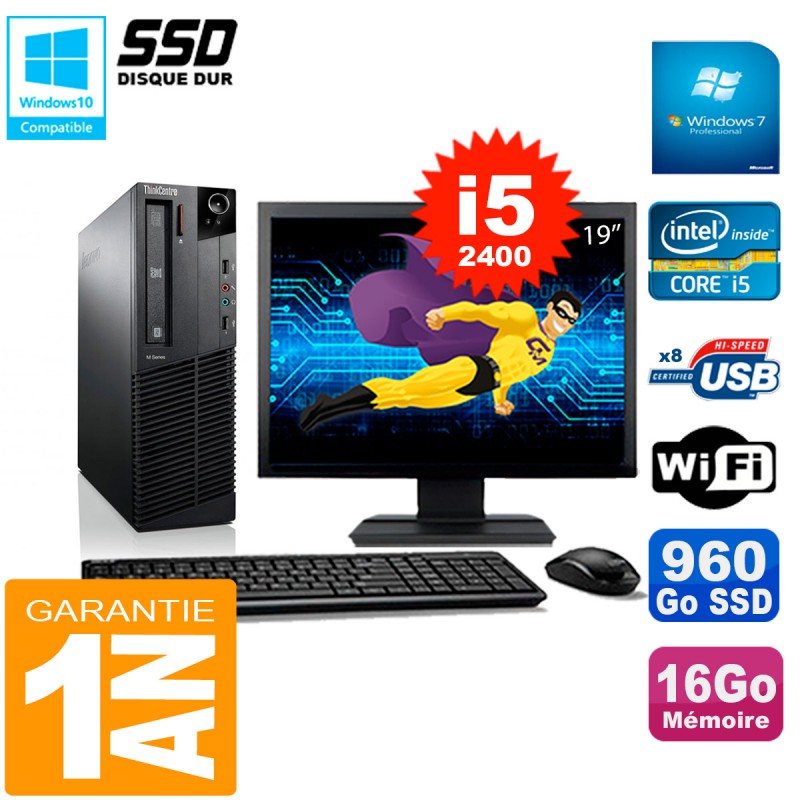 PC Lenovo M92p SFF - Core I5-2400 3,10Ghz (6 Mo de cache) - 16Go DDR3 - Disque Dur 960Go SSD - Graveur DVD - Clé WIFI USB - Windows 7 Pro - Pack Clavier + Souris + Ecran 19" ( Marque et modèle selon arrivages) - Garantie = 1 an.
