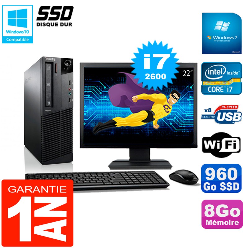 PC Lenovo M92p SFF - Core I7-2600 3,40Ghz (8 Mo de cache) - 8Go DDR3 - Disque Dur 960 Go SSD - Graveur DVD - Clé WIFI USB - Windows 7 Pro - Pack Clavier + Souris + Ecran 22" ( Marque et modèle selon arrivages) - Garantie = 1 an.