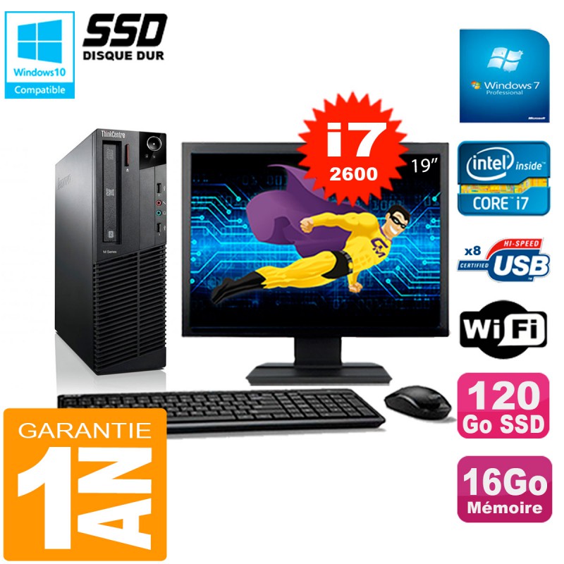 PC Lenovo M92p SFF - Core I7-2600 3,40Ghz (8 Mo de cache) - 16Go DDR3 - Disque Dur 120 Go SSD - Graveur DVD - Clé WIFI USB - Windows 7 Pro - Pack Clavier + Souris + Ecran 19" ( Marque et modèle selon arrivages) - Garantie = 1 an.