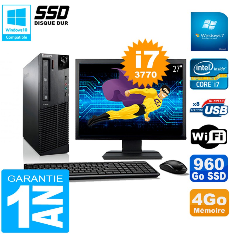 PC Lenovo M92p SFF - Core I7-3770 3,40Ghz (8 Mo de cache) - 4Go DDR3 - Disque Dur 960 Go SSD - Graveur DVD - Clé WIFI USB - Windows 7 Pro - Pack Clavier + Souris + Ecran 27" ( Marque et modèle selon arrivages) - Garantie = 1 an.
