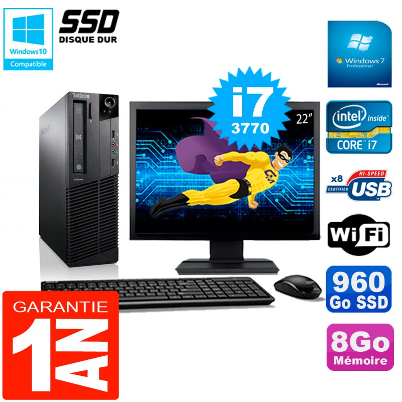 PC Lenovo M92p SFF - Core I7-3770 3,40Ghz (8 Mo de cache) - 8Go DDR3 - Disque Dur 960 Go SSD - Graveur DVD - Clé WIFI USB - Windows 7 Pro - Pack Clavier + Souris + Ecran 22" ( Marque et modèle selon arrivages) - Garantie = 1 an.